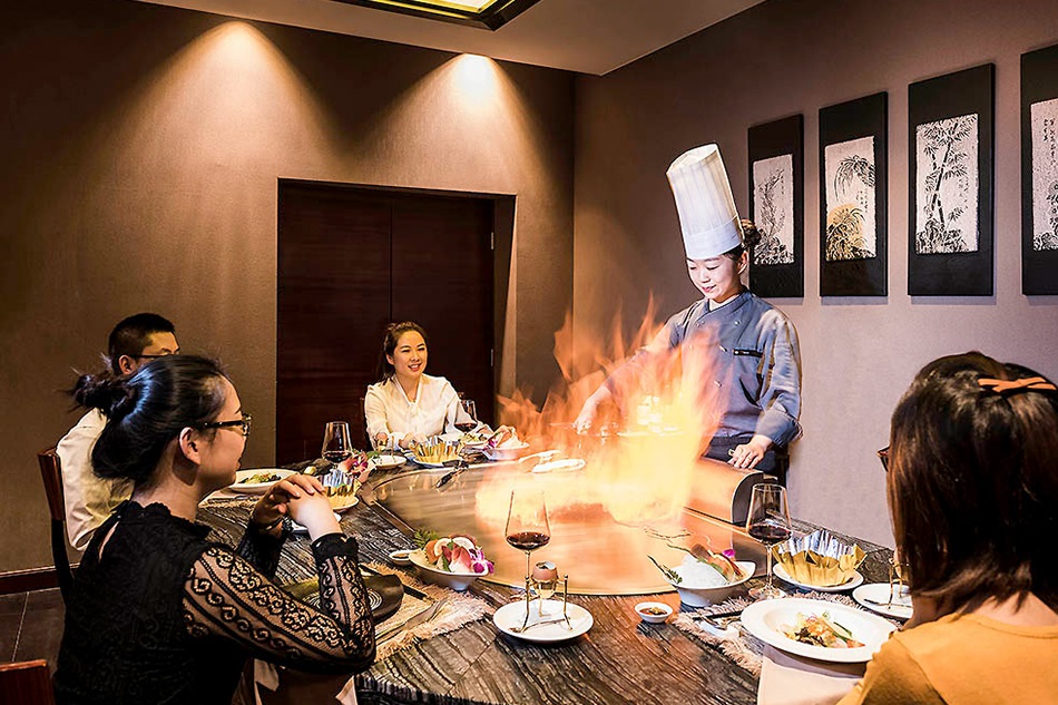 Bàn nướng bằng thép không gỉ sáng bóng tạo độ tương phản với trần tối màu. Sự phản chiếu ánh sáng làm tăng thêm tính sinh động cho màn trình diễn lửa.