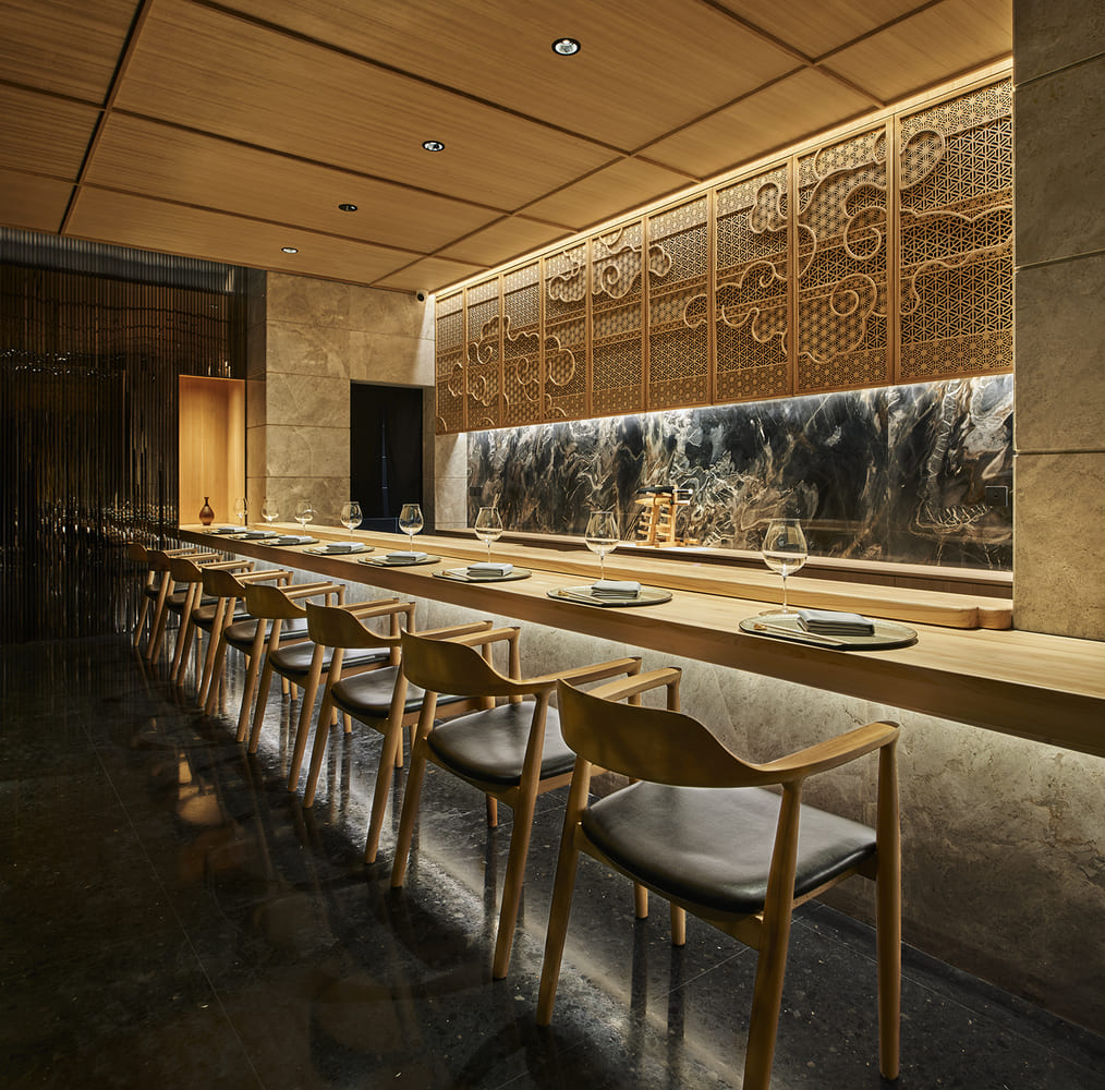 Tâm điểm là quầy Bar chữ U làm từ gỗ Hinoki nguyên bản. Vân tự nhiên tỏa ra mùi hương thoang thoảng dịu nhẹ. Bản vẽ phục vụ nhóm khách VIP với số lượng giới hạn mỗi ca.