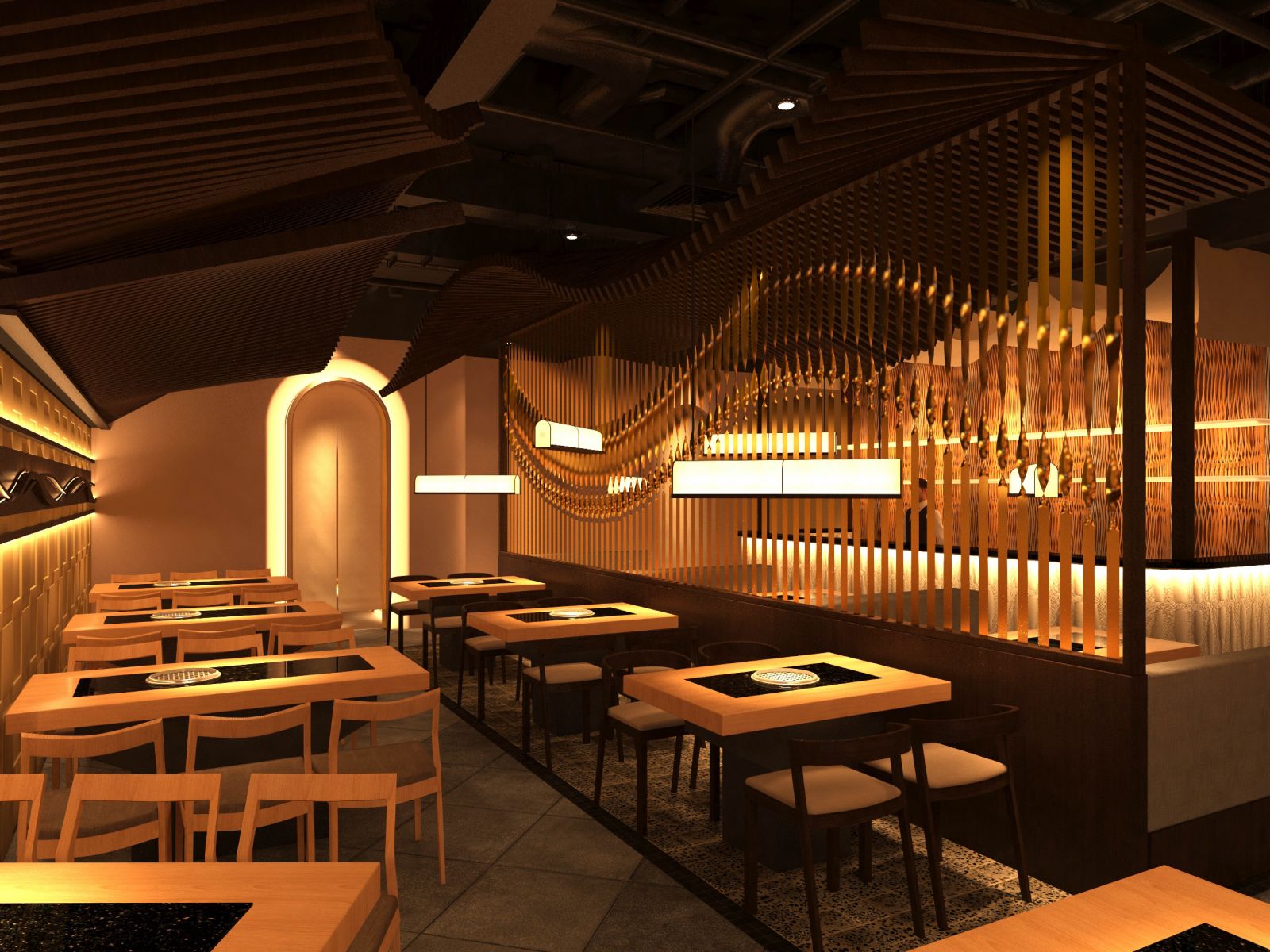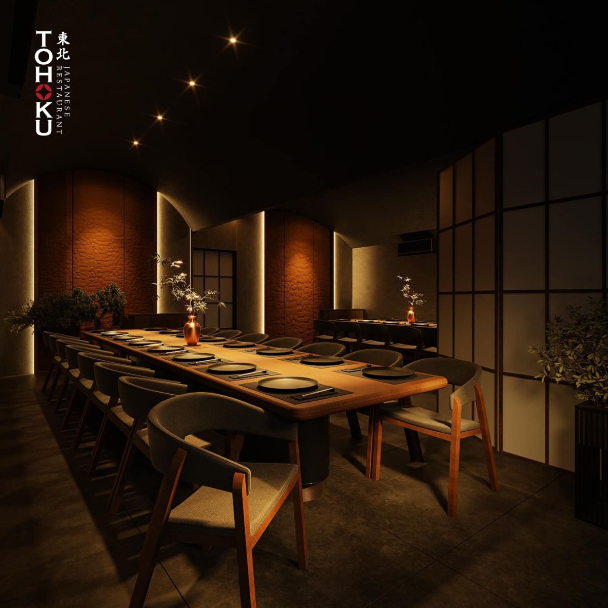 • Thiết kế nhà hàng Nhật Bản hiện đại kết hợp tối giảnvăn hóa Zen/Wabi-sabi, tập trung vào công năngtrải nghiệm toàn diện cho thực khách.